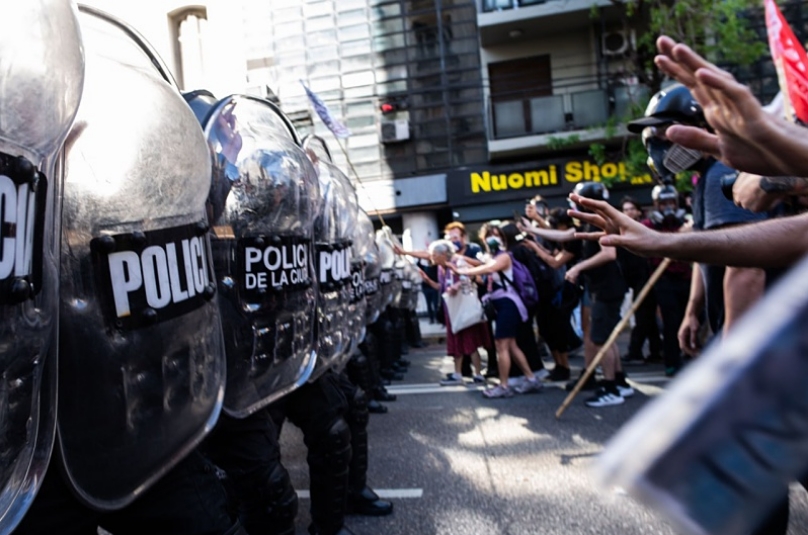 Poco antes de las 16, la Policía de la Ciudad corta completamente el tránsito vehicular a la altura de Paraná. Las columnas de manifestantes jubilados avanzan por Callao al ritmo de la protesta. Cuando llegan a la calle Perón, un grupo de infantería bloquea el paso. Va de fachada a fachada, todo lo ancho de la avenida, incluidas veredas. Los manifestantes se detienen, pero la policía avanza marcialmente golpeando con escudos y bastones. La prensa se atiene a registrar la brutalidad. Y lo peor llega en ese momento, porque la línea de escudos, cada tanto se abre y asoman efectivos a manotazo limpio para arrancar del grupo a periodistas y a manifestantes. Las fotos y filmaciones son fiel registro. No hay agresiones de los militantes contras las fuerzas, sólo resistencia al abuso institucional. En el avance empujan a adultos mayores y tiran al piso a María Rosa Ojeda, una jubilada de más de setenta años, flaquita como un palo. Como siguen avanzando, un periodista la levanta justo antes de que la atropellen.