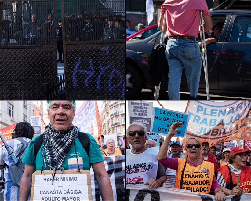 Es 08 de octubre. Miércoles. Hace tres semanas que la estación Congreso de la línea A del subte permanece abierta los miércoles, en plena militarización del palacio y zonas aledañas. Durante el resto del año permaneció cerrada "por operativo policial". Todos los miércoles, los adultos mayores se manifiestan en reclamo de mejoras para sus ingresos, históricamente. Entre las 13 y las 19, toda persona que baje en dicha estación estará sometida a una larga pasarela de cordones policiales provistos de armas largas, pistolas, Taser (picana), Byrna (escopetas de gas comprimido que lanzan municiones rellenas de gas), bastones, chalecos, cascos, escudos, escopetas, celulares, hidrantes, camiones de detención, motos policiales y camionetas antidisturbios.