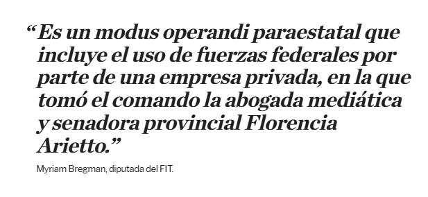De hecho, participó de una de las reuniones con los trabajadores, en representación de la firma. El delegado Leandro Gómez le dijo a LPO cuando estalló el conflicto que uno de los directivos le había confesado que "la Casa Rosada se comprometió a mandar a los gendarmes a romper la asamblea y sacar a los trabajadores".