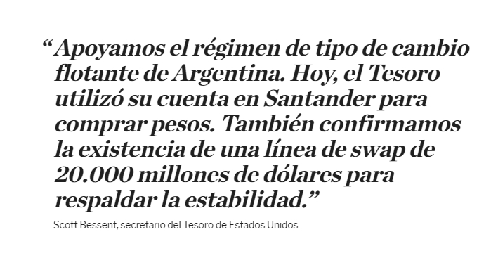 En pocas líneas, Bessent hizo tres cosas a la vez: reveló que utilizó la cuenta que el Tesoro norteamericano tiene en el banco Santander para intervenir en el mercado local y confirmó la existencia de un swap de 20.000 millones de dólares, además defendió públicamente el esquema de flotación que ensaya el gobierno de Milei.