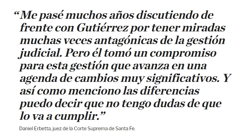 "Me pasé muchos años discutiendo de frente con Gutiérrez por tener miradas muchas veces antagónicas de la gestión judicial. Pero él tomó un compromiso para esta gestión que avanza en una agenda de cambios muy significativos. Y así como menciono las diferencias puedo decir que no tengo dudas de que lo va a cumplir", le dijo Erbetta a LPO.
