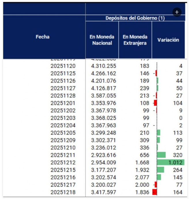 Esa misma planilla muestra el golpe en la caja del Gobierno. En "depósitos del Gobierno en moneda extranjera", el 17 de diciembre figura 2.000 con variación 77 y el 18 cae a 1.836 con variación 164. En criollo: se achica el colchón justo cuando todos preguntan por el pago.