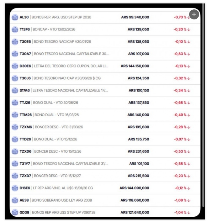 Con ese telón de fondo, los precios de los bonos dejaron de acompañar la narrativa oficial. En pantalla, el AL30 cayó 0,7%, el AE38 bajó 1% y el GD38 retrocedió 1%, entre otros papeles en rojo. Es el modo más sincero que tiene el mercado de decir que está haciendo cuentas que no cierran.