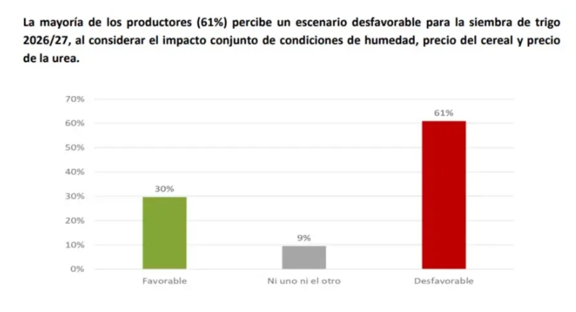 De acuerdo con la encuesta, el 41% de los productores aseguró que sembrará menos trigo en la campaña 2026/27, mientras que un 49% mantendrá la misma superficie y apenas un 9% prevé aumentarla.