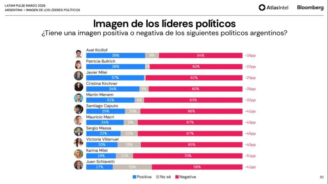 La primera encuesta difundida esta semana siguió la tendencia de las publicadas durante marzo, con la imagen de Milei y de su gestión en caída. En este caso se trató de un trabajo de la consultora Zentrix, que señaló que un 60% consideró negativa la situación económica, un aumento de 12 puntos respecto del mes anterior. También cayó la imagen personal del Presidente, que quedó por debajo de la ministra de Seguridad, Patricia Bullrich. Sin embargo, en este sondeo todavía supera a Kicillof, algo que en otras encuestas comenzó a revertirse, para nerviosismo de un gobierno que no logra recuperar la iniciativa. La agenda sigue dominada por los casos de corrupción libertarios, en un clima social marcado por el agobio económico.