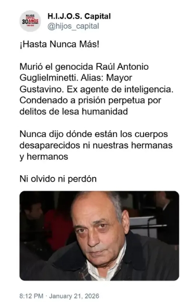 La agrupación H.I.J.O.S Capital confirmó públicamente el fallecimiento del represor y recordó su silencio frente a los crímenes cometidos. "Murió el genocida Raúl Antonio Guglielminetti. Nunca dijo dónde están los cuerpos desaparecidos ni nuestras hermanas y hermanos. Ni olvido ni perdón", expresaron desde la organización.