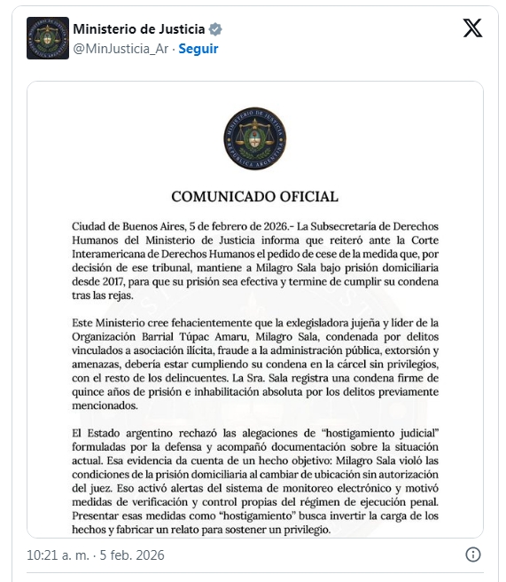 El pedido que redobla la persecución política contra la extitular de la organización Tupac Amaru fue confirmada a través de un comunicado del Ministerio de Justicia. El texto sostiene que Sala "fabrica un relato para sostener un privilegio" y la acusa de ser "un criminal (SIC, en masculino) que robó a los pobres".
