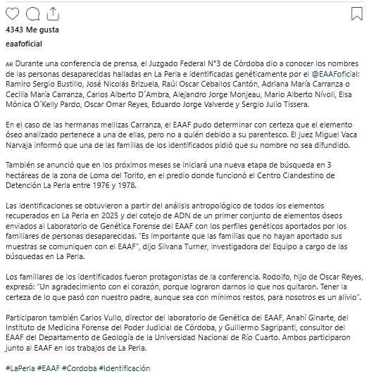 Este miércoles por la mañana se llevó a cabo una conferencia de prensa en el Juzgado Federal 3 de esa provincia con la participación de su titular, el juez Miguel Hugo Vaca Narvaja, y familiares de las víctimas, querellas y miembros del Equipo Argentino de Antropología Forense (EAAF) para dar precisiones sobre la identificación. También formaron parte de la jornada Carlos Vullo, director del laboratorio de genética forense, y Silvana Turner, a cargo de los trabajos en La Perla.