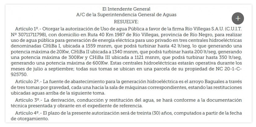 Según consta en el Boletín Oficial N° 6357 del 23 de enero de 2025, específicamente en la página 21, el gobierno de Alberto Weretilneck otorgó a la firma Río Villegas S.A.U. el permiso para el uso de agua pública con fines de generación eléctrica privada. Allí se detalla que la empresa podrá operar tres centrales -denominadas CHiBa I, II y III- dentro de una parcela de su propiedad, utilizando caudales específicos del arroyo Baguales para abastecer un emprendimiento propio.