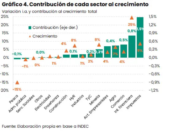 De forma más detallada, el crecimiento se debió a componentes discutibles: un tercio del crecimiento provino de Impuestos netos de subsidios (no producción real) y otro aporte clave fue de Intermediación financiera, que creció en parte por el spread de tasas, no por mayor crédito real. De hecho, el informe del centro económico de la UBA, estimó que si se excluyen estos componentes el crecimiento bajaría del 4,4% a 2,7%. Es decir, hay una "sobreestimación del crecimiento".