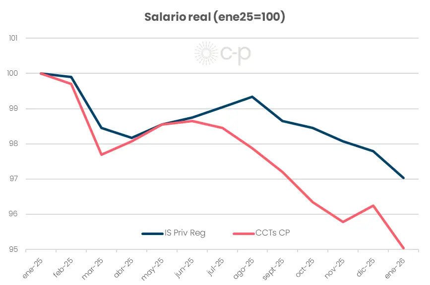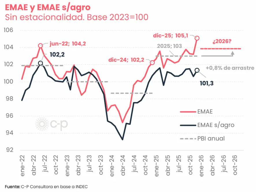 Aun en un escenario en el que la economía logre crecer, el patrón que se perfila no necesariamente implicaría una mejora extendida. La expansión aparece cada vez más concentrada en pocos sectores —agro, minería y finanzas—, mientras que las actividades intensivas en empleo siguen rezagadas. A esto se suma un problema adicional: parte del crecimiento reciente está explicado por componentes no productivos, lo que tiende a sobreestimar la dinámica real de la economía. En otras palabras, incluso si los números agregados dan positivo, podría repetirse la lógica de 2025: una economía que crece en las estadísticas, pero no en el bolsillo.Qué esperar para 2026Las perspectivas para la actividad económica de este año son, cuanto menos, poco alentadoras: un crecimiento por arrastre, pero sin señales de recuperación sólida. Al respecto, el rebote estadístico heredado convive con una economía real débil y un programa económico que sigue atado al ancla salarial (tope de aumentos) en un intento por controlar la inflación (acumula ocho meses al alza) pero con efectos concretos en el consumo, la recaudación y el nivel de actividad.