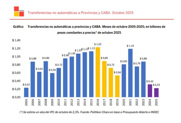 El informe de Politikon Chaco remarca que debido a una cautelar de la Corte Suprema de 2024 que ordenó al Gobierno Nacional devolver a la Ciudad de Buenos Aires fondos por equivalente al 2,27% del PBI, que Alberto Fernández había eliminado por decreto, ahora el distrito federal se lleva casi la mitad de los envíos.