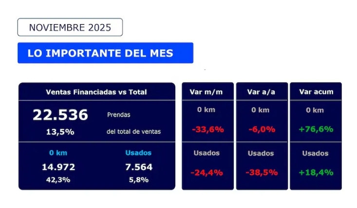 Pese a este freno puntual, el acumulado anual sigue siendo positivo: entre enero y noviembre, las prendas sobre autos nuevos crecieron 76,6% respecto de 2024.
