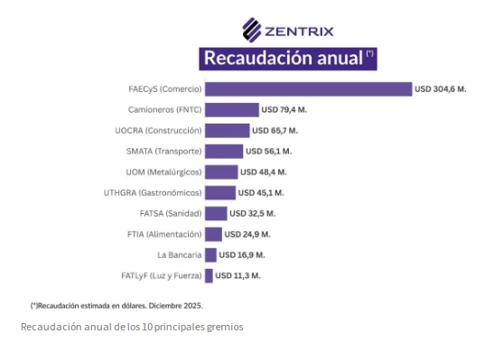 Los aportes sindicales obligatorios en Argentina generan un flujo anual de u$s685 millones para los 10 gremios más grandes, según un informe de Zentrix Consultora. Este monto surge de descuentos aplicados sobre el salario formal, incluso a trabajadores no afiliados, y en pesos supera ampliamente el billón por año. "El poder sindical en Argentina: estructura, financiamiento y límites a la libertad del trabajador" expone la magnitud del financiamiento sindical compulsivo y revela un esquema de alta concentración, escasa transparencia y conducciones que se sostienen durante décadas gracias a este flujo permanente de recursos.