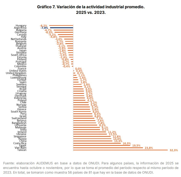 El informe, elaborado por la consultora Audemus, señala que la producción industrial argentina acumuló una caída promedio del 7,9% en esos dos años, un retroceso que solo fue superado por Hungría, donde la contracción llegó al 8,2%.