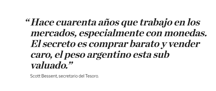 "Hace cuarenta años que trabajo en los mercados, especialmente con monedas. El secreto es comprar barato y vender caro, el peso argentino esta sub valuado", arriesgó Bessent, en una firmación que contradice el consenso de los economistas e incluso del FMI que esperan que después de las elecciones de octubre se produzca una devaluación.