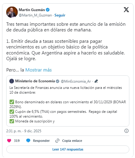El exministro de Economía de Alberto Fernández, Martín Guzmán, no dejó pasar el anuncio de un nuevo endeudamiento y compartió un análisis en redes sociales, con algunas advertencias.