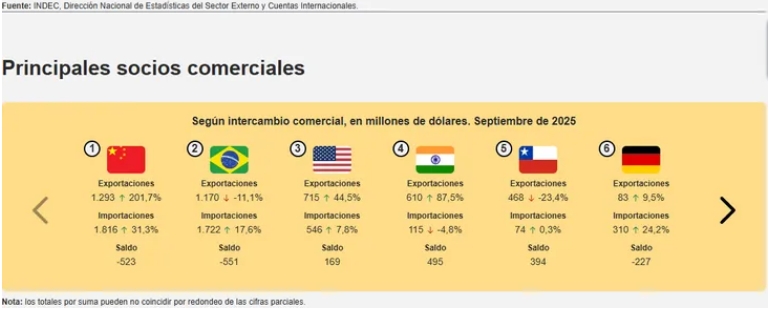 El INDEC informó este lunes que China concentró el 15,9% de las exportaciones totales y el 25,2% de las importaciones, lo cual representó un intercambio bilateral de u$s3.109 millones. Mientras tanto, Brasil explicó el 14,4% de las ventas y el 23,9% de las compras, equivalente a un intercambio de u$s2.892 millones.