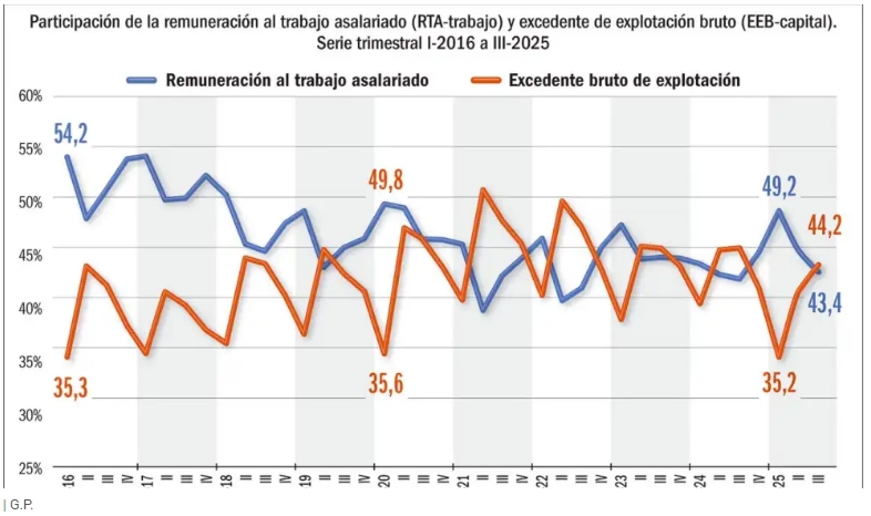 1. 2025: continúa en retroceso la participación del trabajo, cae un 6% en los primeros nueve meses, para el mismo período el capital recupera el 9%
