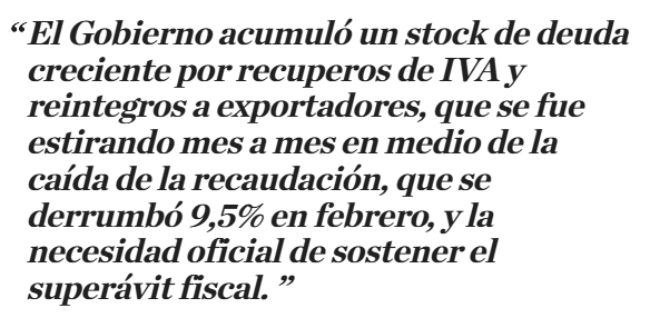 Eso es lo que viene ocurriendo desde el último trimestre del año pasado. El Gobierno acumuló un stock de deuda creciente por recuperos de IVA y reintegros a exportadores, que se fue estirando mes a mes en medio de la caída de la recaudación, que se derrumbó 9,5% en febrero, y la necesidad oficial de sostener el superávit fiscal.