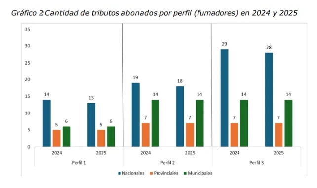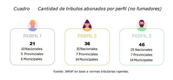 El reporte indica que una persona que no consume cigarrillos (ya que estos pagan impuestos) en el primero de los casos paga al año 21 impuestos al año (10 nacionales, 5 provincias, 6 municipales) , el segundo 36 (15 nacionales, 7 provinciales, 14 municipales) y el tercero 46 tributos (25 nacionales, 7 provinciales, 14 municipales).