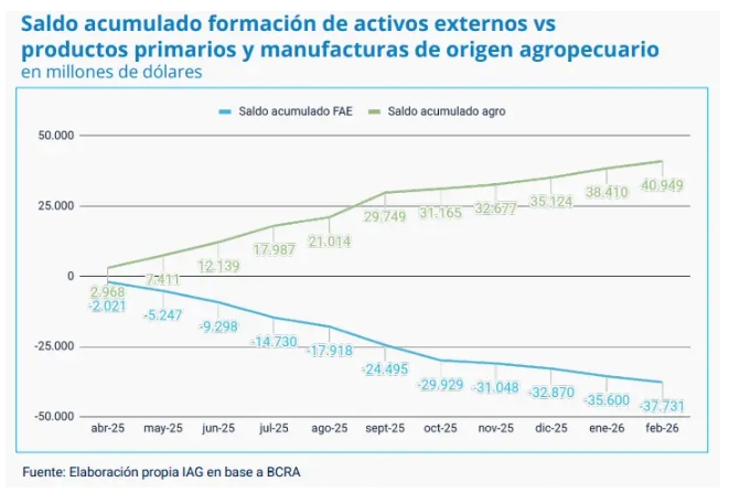 Sin embargo, lejos de financiar inversión o actividad, los dólares del principal complejo exportador del país se canalizan cada vez más hacia la dolarización de carteras, en un proceso que limita la acumulación de reservas y condiciona la estabilidad cambiaria. La formación de activos externos -comúnmente asociada a la fuga de capitales- refleja la compra de divisas para atesoramiento, giro al exterior o inversión fuera del país por parte del sector privado. Solo en febrero de 2026, este concepto registró una salida de USD 2.131 millones, consolidando una tendencia creciente desde noviembre del año pasado.