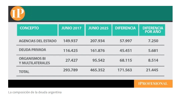Esta misma deuda en el año 2017 sumaba u$s143.852 millones, esto implica que en los últimos 8 años nos endeudamos a un ritmo de u$s14.195 millones por año. Lo más interesante es que del total de endeudamiento, la deuda privada aumentó en u$s45.451 millones, mientras que la deuda con el FMI y organismos bi y multilaterales aumento en u$s68.115 millones.