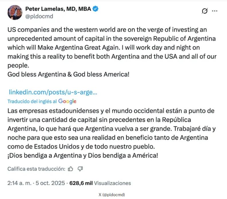 Tal vez, hayamos pasado de una posición antimperialista cerrada del kirchnerismo que no nos dejaba crecer a la posición de mascota de Milei y luego permita una síntesis superadora que nos traiga el desarrollo apalancado por inversiones de Estados Unidos que generen imitación en otros agentes económicos, incluyendo los propios argentinos. ¿Qué hay detrás de las inversiones de Estados Unidos y su preocupación por sostener a Milei?