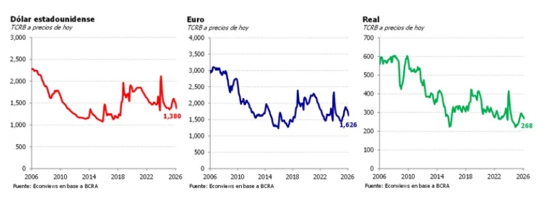 Cabe recordar que, a precios de hoy el "billete verde" llegó a valer $1.545 en septiembre de 2025, luego de un fuerte período de atraso durante los primeros meses del Gobierno de Javier Milei. Actualmente, el Tipo de Cambio Real Multilateral (TCRM) llegó a tocar mínimos desde fines de junio del año pasado.