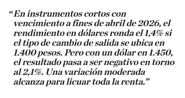 Los números lo muestran con claridad. En instrumentos cortos con vencimiento a fines de abril de 2026, el rendimiento en dólares ronda el 1,4% si el tipo de cambio de salida se ubica en 1.400 pesos. Pero con un dólar en 1.450, el resultado pasa a ser negativo en torno al 2,1%. Una variación moderada alcanza para licuar toda la renta.