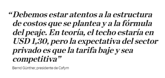 "Debemos estar atentos a la estructura de costos que se plantea y a la fórmula del peaje. En teoría, el techo estaría en USD 1,30, pero la expectativa del sector privado es que la tarifa baje y sea competitiva. Vamos a acompañar el proceso", dijo a LPO Bernd Günther, presidente de Cafym, sobre la licitación de la ANPYN.