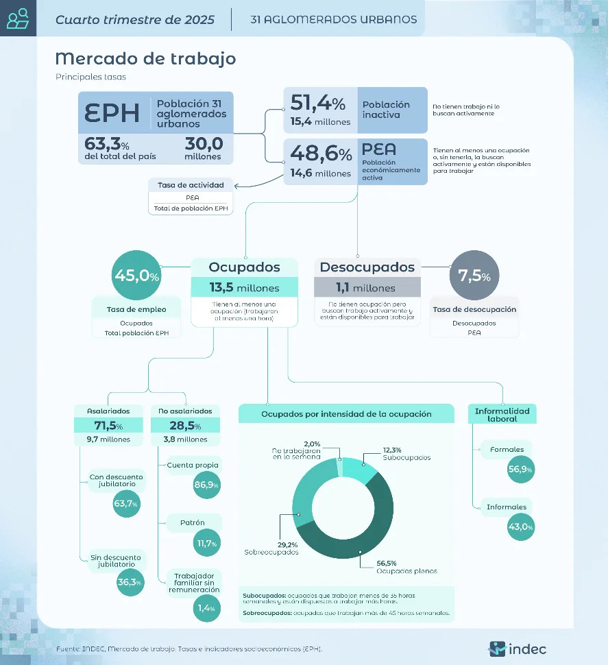 El mercado laboral argentino terminó 2025 con señales de fuerte deterioro. Según datos del Instituto Nacional de Estadística y Censos (INDEC), la tasa de desempleo alcanzó el 7,5% en el cuarto trimestre, con un incremento de 1,1 puntos porcentuales respecto al mismo período de 2024.
