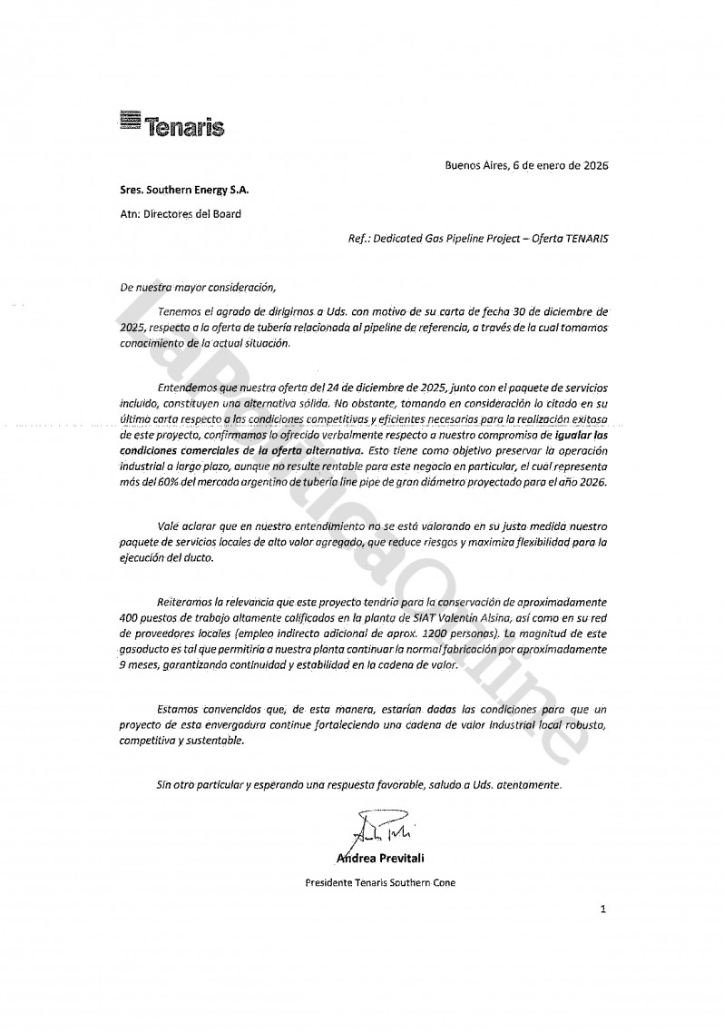 Con ese panorama, el consorcio Southern Energy decidió aceptar la propuesta de los indios y el 23 de diciembre firmó el contrato. Un día después, Tenaris hizo una nueva oferta donde la diferencia con Welspun se reducía a unos 40 millones de dólares, pero desde el consorcio consideraron el tema estaba cerrado.