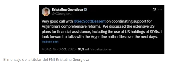 El mensaje, difundido a través de la cuenta oficial de Georgieva en X (ex Twitter), ratifica que Washington trabaja en "amplios planes de asistencia financiera" para respaldar al país, incluyendo un mecanismo clave: el uso de las tenencias estadounidenses de Derechos Especiales de Giro (DEG), la moneda del FMI.