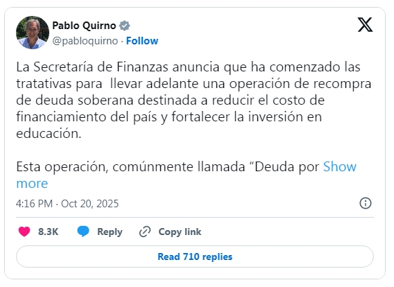 Sobre la inversión en educación, Quirno precisó que los ahorros generados de esta operación serán destinados a "consolidar la inversión educativa de largo plazo, reafirmando el compromiso del Gobierno con el desarrollo del capital humano y el futuro de los argentinos".