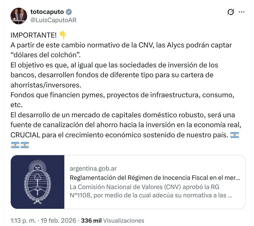 La medida fue dispuesta por la CNV y anunciada por el ministro de Economía, Luis Caputo, en un posteo en la red social "X" en la que informó que "las Alycs podrán captar 'dólares del colchón'", el eufemismo que utiliza el oficialismo libertario para esconder que se trata tanto del stock como del flujo de fondos generados en actividades no declaradas al fisco, que pueden ser legales o ilegales mientras el organismo recaudador no lo detecte por la presunción de la inocencia fiscal.