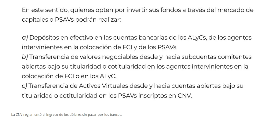 La norma de la CNV dispone que los fondos no declarados pueden depositarse en efectivo en las cuentas bancarias de los ALyCs, de los agentes intervinientes en la colocación de FCI y de los PSAVs (Proveedores de Servicios de Activos Virtuales, que invierten en criptoactivos).