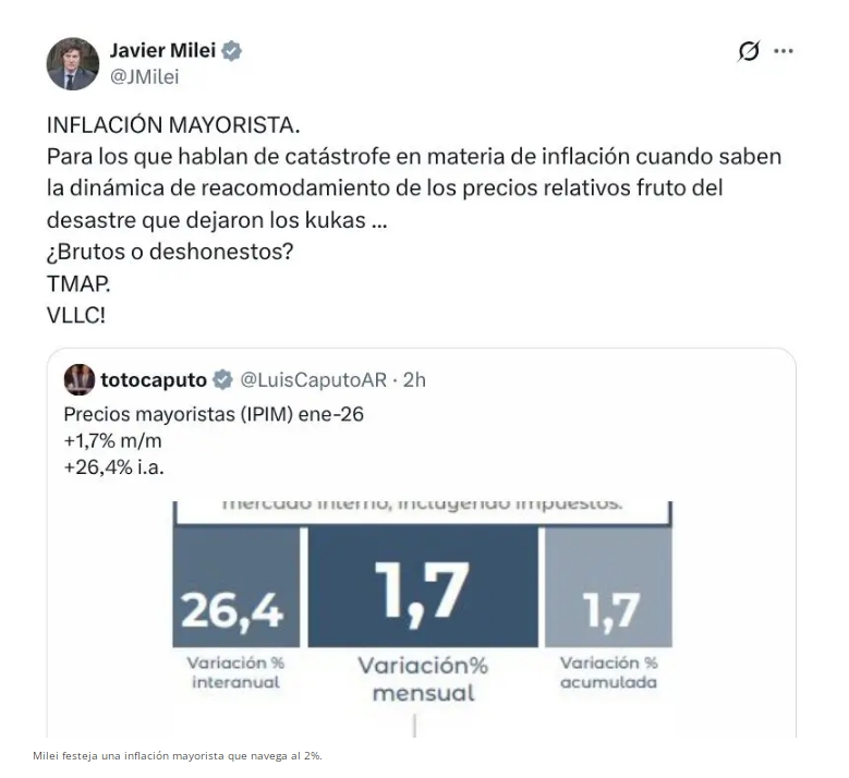 El presidente Javier Milei volvió a culpar al "desastre que dejaron los kulas" para destacar el supuesto logro de la inflación mayorista global de 1,7% en enero y 26,4% acumulada en un año, sin dimensionar que en recesión económica los precios mayoristas siguen navegando en el orden del 2% mensual desde hace 8 meses.