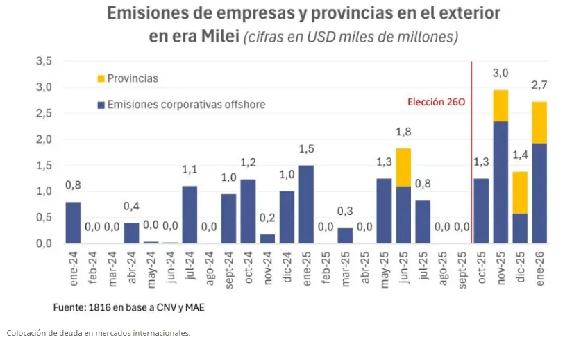 Esa rentabilidad asegurada está impulsando el nuevo ciclo de endeudamiento de las empresas, que en enero emitieron Obligaciones Negociables en el mercado internacional por 1.900 millones de dólares, en el mercado local por 1.300 millones de dólares y tomaron créditos en el sistema financiero por otros 1.100 millones de dólares (netos entre cancelaciones y nuevos préstamos).