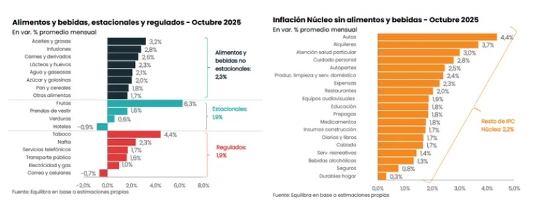 Alimentos y bebidas, en tanto, marcó un alza de 1,4%, aunque se aceleró fuerte a lo largo del mes. Panificados y carnes mostraron más dinamismo que en septiembre, pero hubo moderación en aceites, frutas y lácteos, y una baja en verduras.