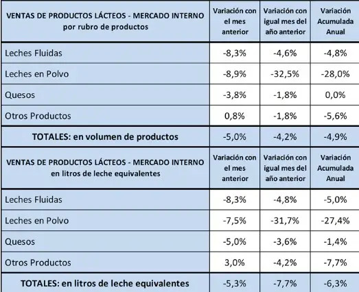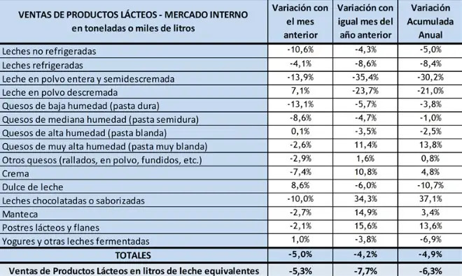 Las ventas de productos lácteos registraron una nueva contracción en febrero, consolidando una tendencia negativa en el consumo masivo. De acuerdo con datos oficiales del sector, el volumen comercializado cayó 5% respecto a enero, mientras que medido en litros de leche equivalente la baja fue aún mayor, del 5,3%.