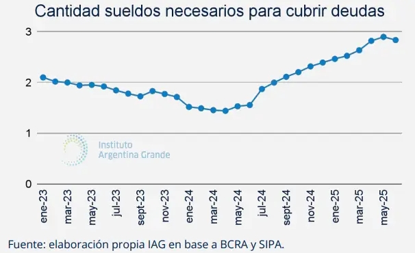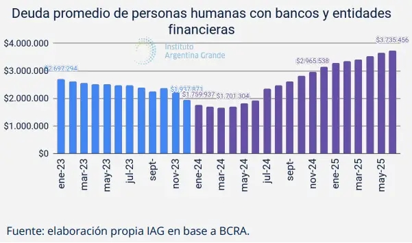 "Un tercio de los argentinos les deben plata a los bancos, y la deuda promedio de las personas endeudadas es de $3,7 millones de pesos", estimaron desde el IAG. Según los especialistas, la mediana se sitúa en el intervalo de entre $750.000 y $1.000.000; es decir que la mitad de las y los deudores adeudan este monto.