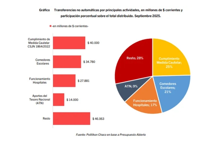 "En el noveno mes del año, las transferencias no automáticas del gobierno nacional a provincias y CABA totalizaron $162.723 millones (etapa pagada). Respecto a septiembre de 2024, estos envíos cayeron 56,1% en términos reales; se trata del segundo descenso consecutivo", señaló la consultora Politikon Chaco.