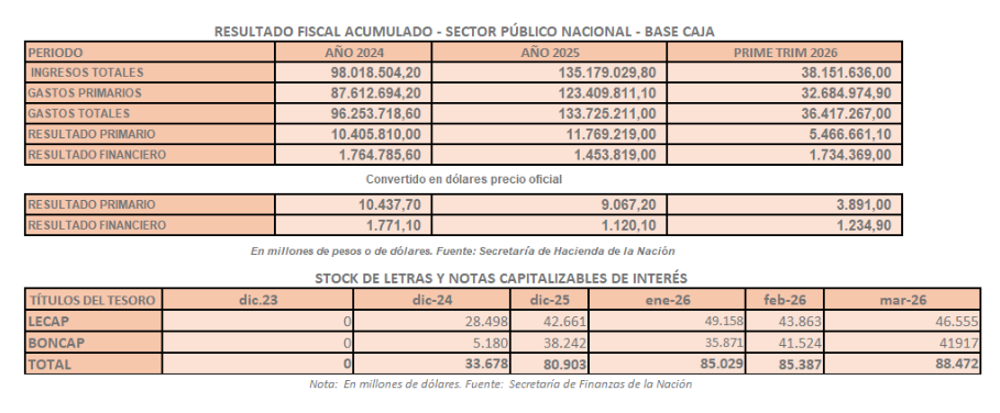 Y para el primer trimestre 2026, el superávit primario acumulado fue de un equivalente a 3.891 millones de dólares, pero se capitalizaron intereses por 7.569 millones de dólares que, de haberse pagado, significan un déficit fiscal de 3.678 millones de dólares.