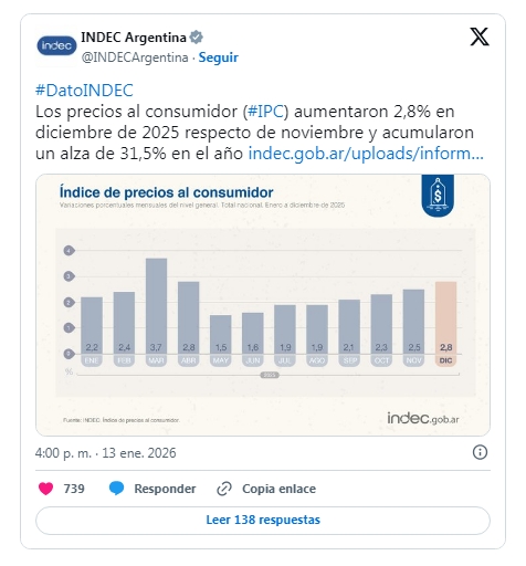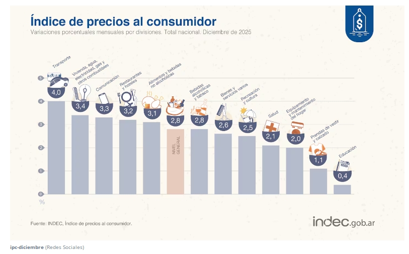 El Instituto Nacional de Estadística y Censos (INDEC) dio a conocer este martes el Índice de Precios al Consumidor (IPC) de diciembre de 2025. La inflación del último mes del año fue de 2,8% y el acumulado de los doce meses alcanzó el 31,5%.