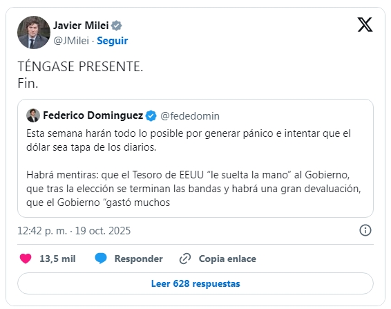 En el tuit al que hace referencia Milei, Domínguez comenzó diciendo: "Esta semana harán todo lo posible por generar pánico e intentar que el dólar sea tapa de los diarios. Habrá mentiras: que el Tesoro de EEUU "le suelta la mano" al Gobierno, que tras la elección se terminan las bandas y habrá una gran devaluación, que el Gobierno "gastó muchos dólares" en intervenir, que los pagos de deuda están en riesgo, y mucho más".