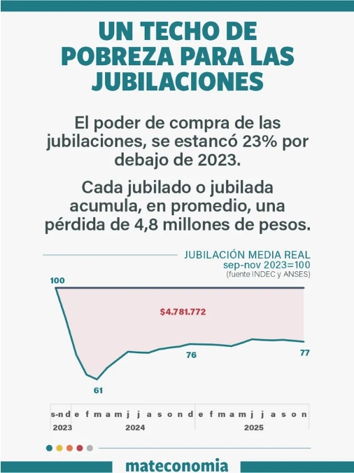 Según estimaciones del Mirador de la Actualidad del Trabajo y la Economía (MATE), cada jubilado perdió en promedio casi 5 millones de pesos desde la asunción del actual gobierno. En términos macro, el recorte acumulado sobre jubilaciones y pensiones asciende a 16,5 billones de pesos, una cifra que explica buena parte del "ahorro" fiscal que exhibe la Casa Rosada. El haber medio quedó 23% por debajo del nivel de 2023 y la jubilación mínima apenas cubre un tercio del costo real de la canasta básica para personas mayores.
