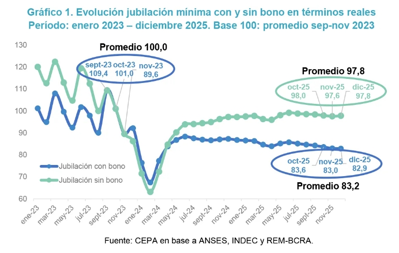 El bono de 70 mil pesos, congelado desde marzo de 2024, profundizó la licuación. Según CEPA, para conservar su poder de compra debería haber alcanzado en diciembre de 2025 los 177.485 pesos. La brecha explica por qué los jubilados de menores ingresos son los más afectados por el ajuste.