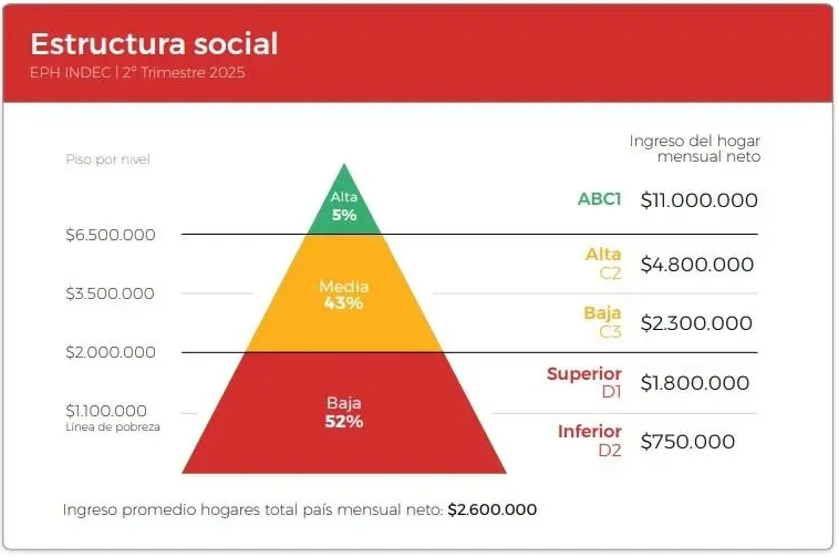 Si se toman la estratificación de ingresos, 7 millones de hogares argentinos son de clase media, 8 millones de clase baja y menos de 1 millón de clase alta, según un informe especial de PensarLab, el laboratorio de investigación de la Fundación Pensar. El informe analiza cómo la clase media argentina, históricamente emblema de cohesión y movilidad social, atraviesa un proceso de transformación profunda, en un contexto de incertidumbre económica y cambio cultural acelerado.