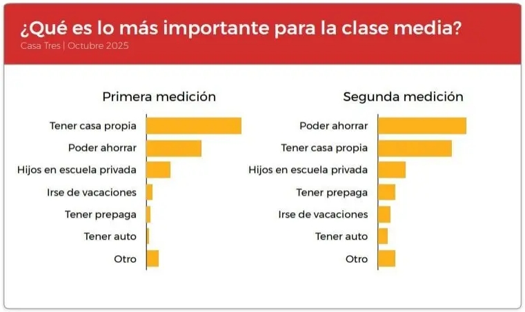 La mitad de los argentinos (48%) cree que "tener casa" es lo más importante para la clase media. Actualmente, según cifras del INDEC, uno de cada tres argentinos no tiene casa propia. "Hoy, los argentinos sienten que la clase media está en retroceso, el 55% cree se está achicando, sólo dos de cada diez que está creciendo y otros dos que se mantiene igual", explican .